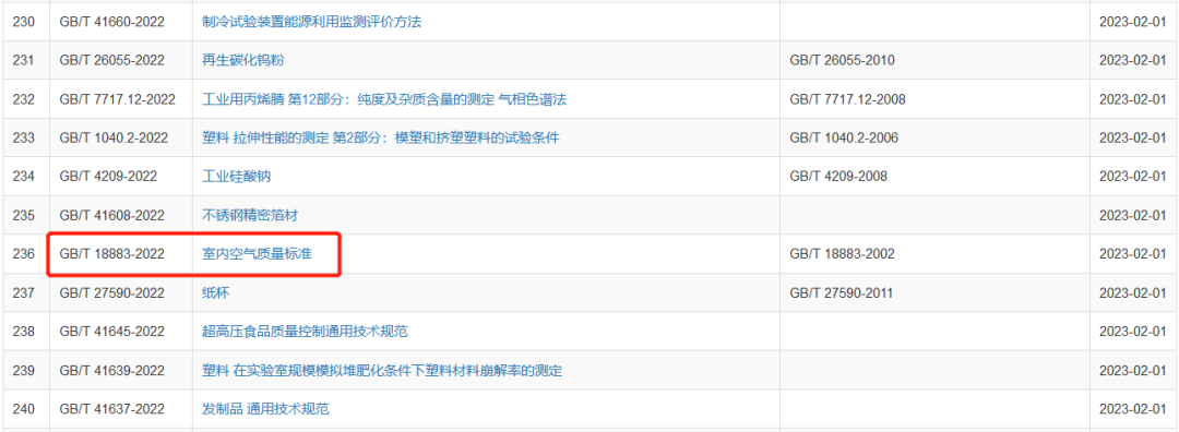 我國(guó)新版GB/T 18883-2022《室內(nèi)空氣質(zhì)量標(biāo)準(zhǔn)》于2022年7月11日經(jīng)國(guó)家市場(chǎng)監(jiān)督管理總局(國(guó)家標(biāo)準(zhǔn)化管理委員會(huì))批準(zhǔn)發(fā)布,代替GB/T 18883-2002《室內(nèi)空氣質(zhì)量標(biāo)準(zhǔn)》,自2023年2月1日起實(shí)施。